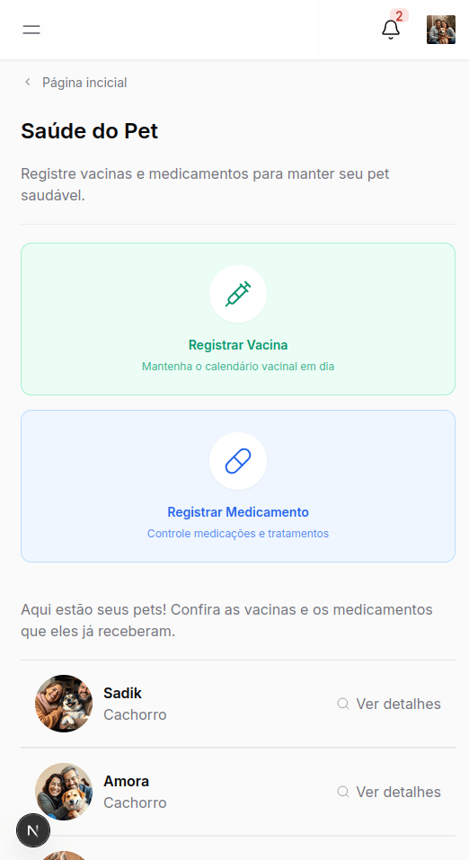 Gerencie vacinas, remédios e memórias do seu pet em um só lugar, sem precisar de caderneta ou papelada.