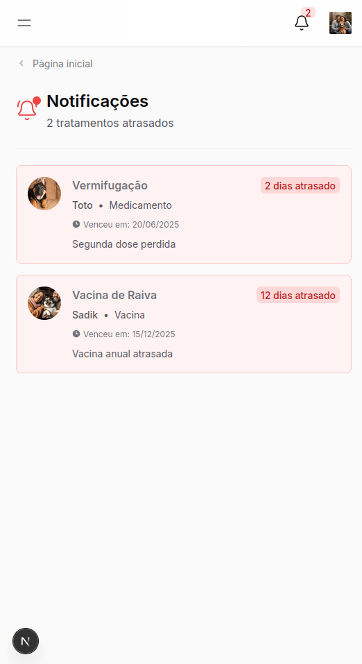 Receba notificações por email e SMS quando chegarem as datas de renovação de vacinas e medicamentos dos seus pets.