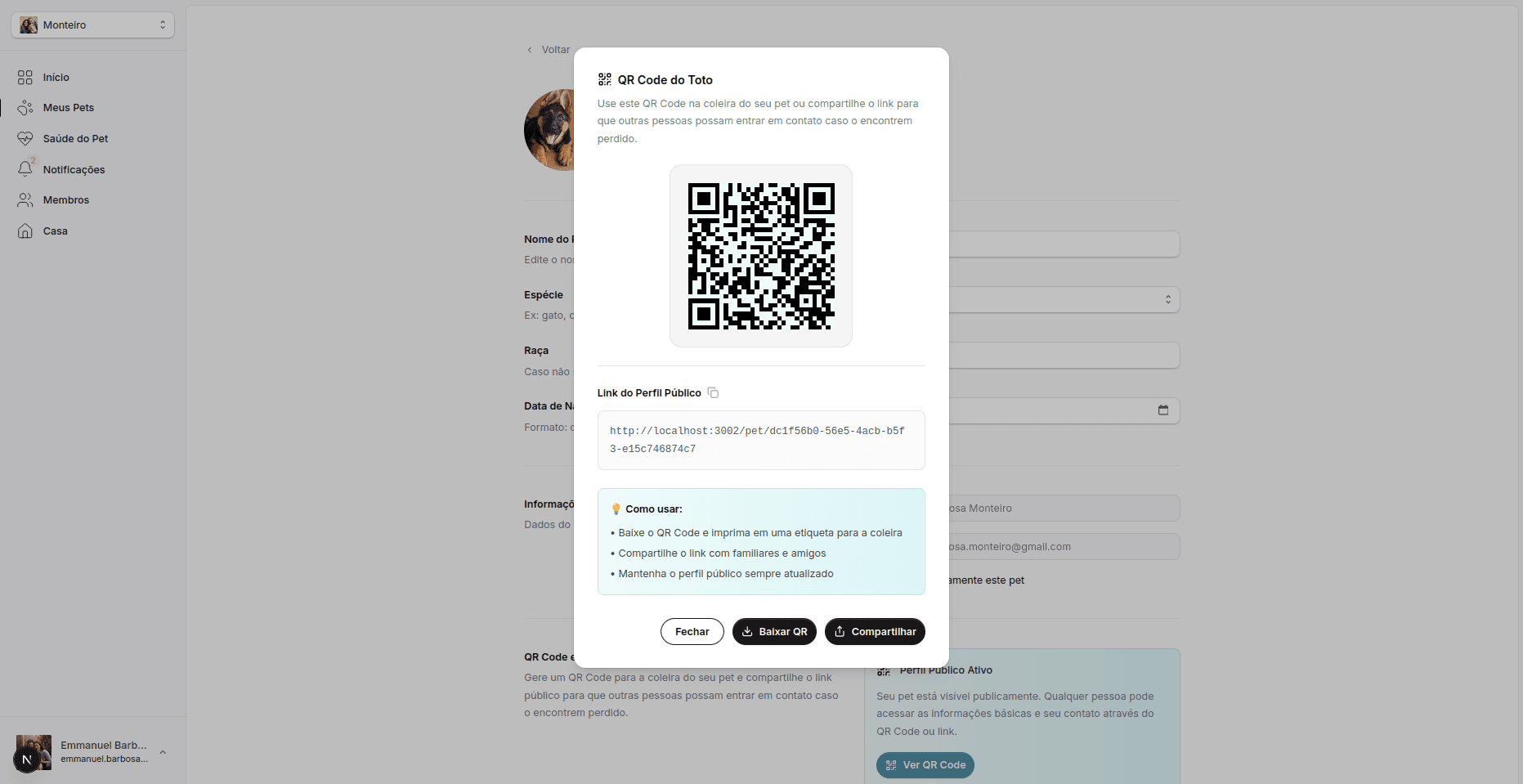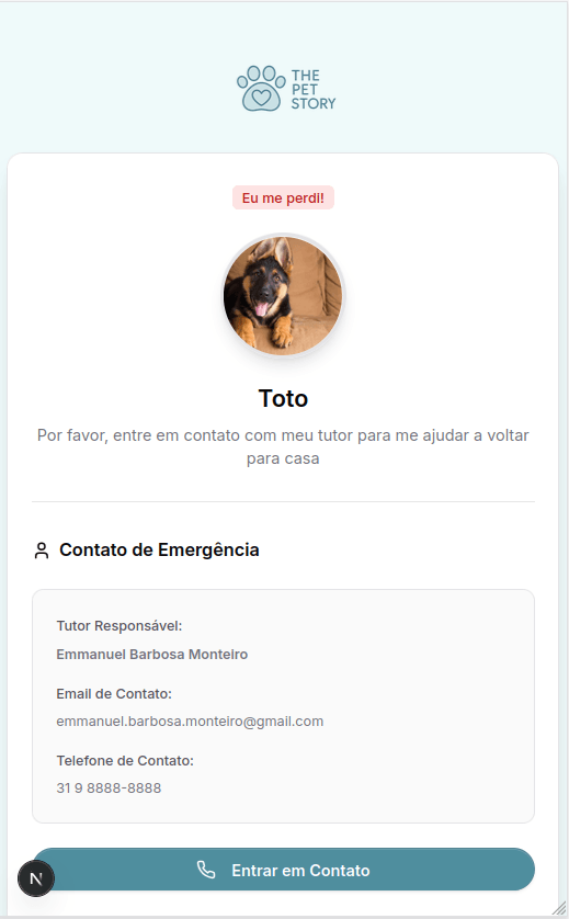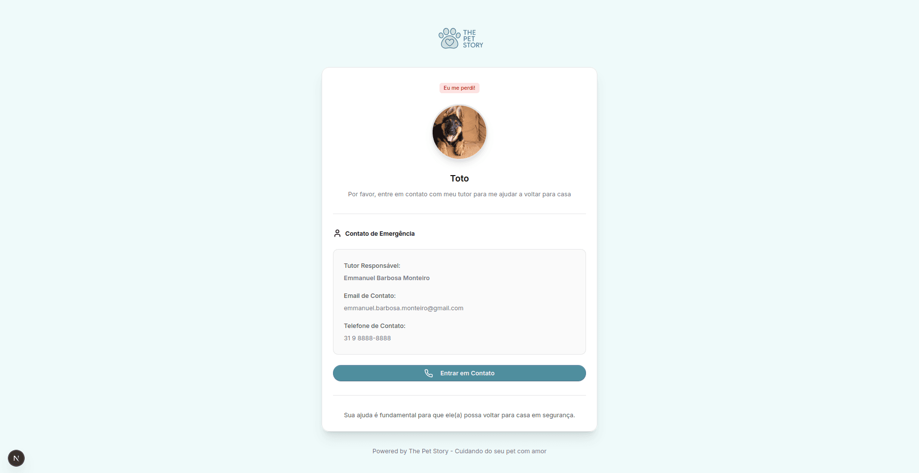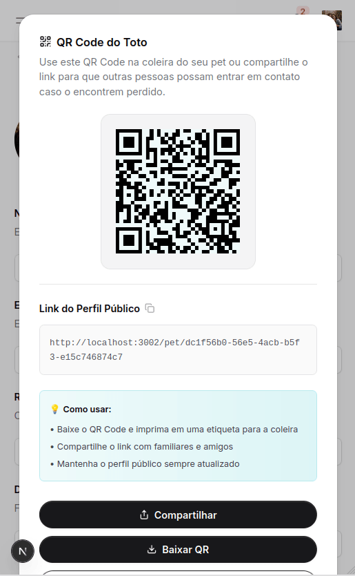 Perfis públicos acessíveis via QR Code ou link. Qualquer pessoa pode entrar em contato se encontrar seu pet perdido.